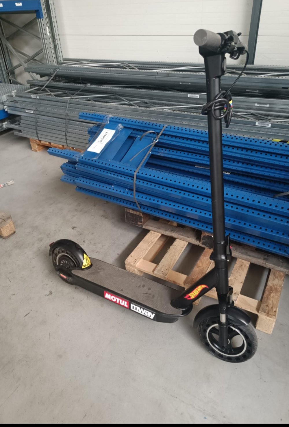 Sivé gumenné rukoväte a protišmyková podložka, odpruženia predná vidlica , poškriabaný display, odtrhnutý držiak na blatníku na zaistenie zloženej kolobežky, značne ponálepkovaná nálepkami satanwagen, kozabobkov, seduced, motul, mway, penis na palube